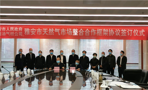 2020年4月20日,雅安市人民政府和西南油氣田公司雅安市天然氣市場整合合作框架協(xié)議簽約儀式在成都舉行。雅安市市委書記蘭開馳,市委副書記、市長鄒瑾,市委常委吳宏,市政府秘書長李陽軍,市政府副秘書長馮貴強,西南油氣田公司黨委書記、總經(jīng)理謝軍,黨委委員、副總經(jīng)理李寶軍,總經(jīng)理助理兼營銷部主任賀志明就推進(jìn)雙方合作深入交流,并見證協(xié)議簽約。