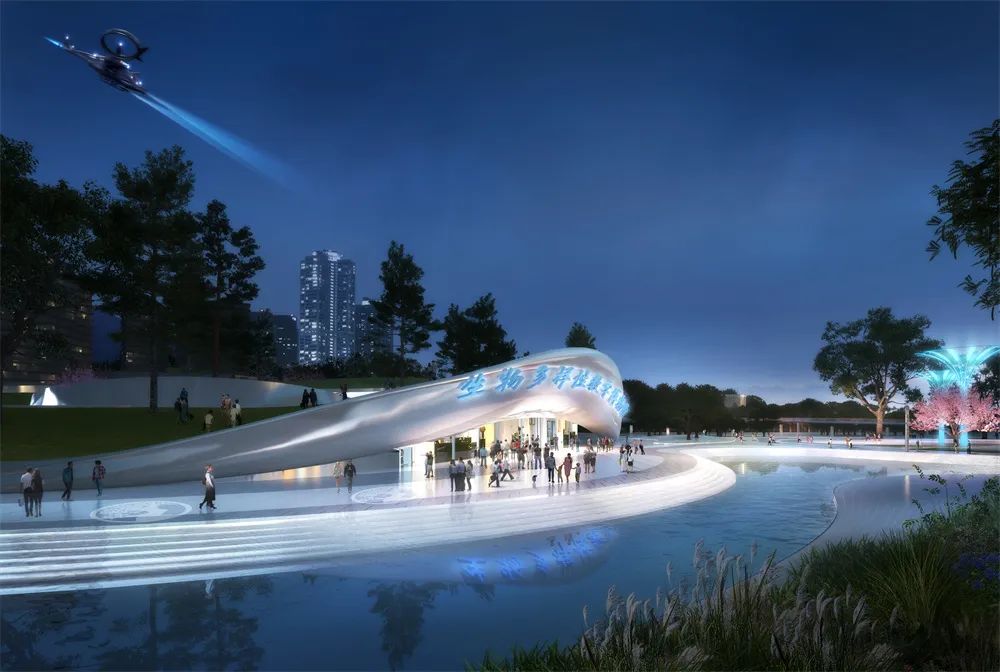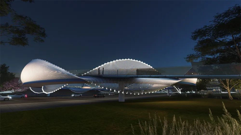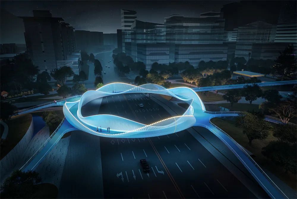 設(shè)計(jì)環(huán)形人行天橋,猶如一朵盛開(kāi)的嬌艷的花,有機(jī)聯(lián)系起項(xiàng)目的南北地塊,同時(shí)兼顧新區(qū) 大道的人行過(guò)街功能,結(jié)合燈光藝術(shù)營(yíng)造,也將成為該片區(qū)一個(gè)標(biāo)志性的打卡點(diǎn),象征著雅安因多樣而美麗,因共生而繁盛;颦h(huán)圍欄展示雅安特色物種。地面燈光按植物花色進(jìn)行分段布置,同時(shí)通過(guò)投影設(shè)備和交互式燈光等設(shè)施,增加游人體驗(yàn)感。環(huán)形橋跨越機(jī)動(dòng)車道,基因環(huán)的出現(xiàn)開(kāi)始了生物密碼的探索之旅。