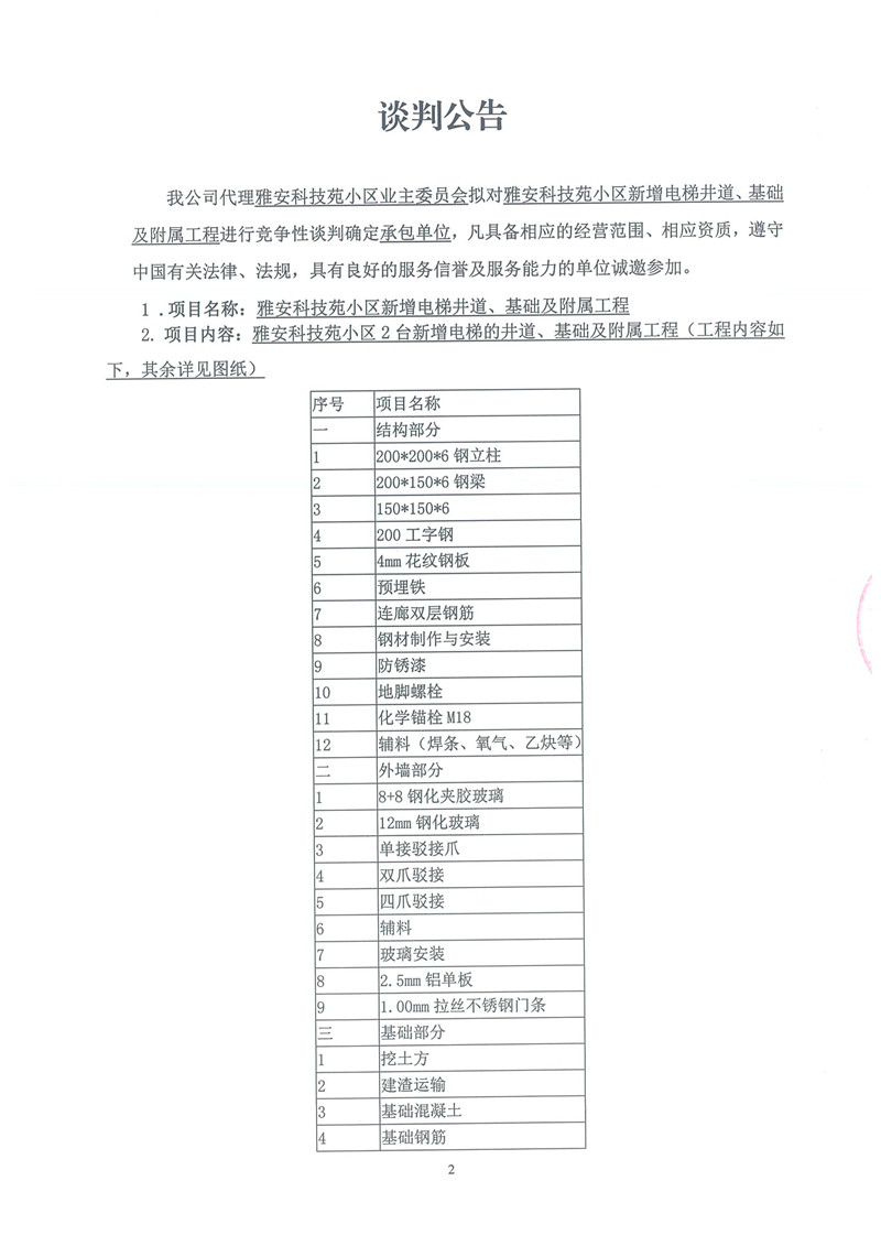 雅安科技苑小區(qū)新增電梯井道、基礎(chǔ)及附屬工程——競爭性談判