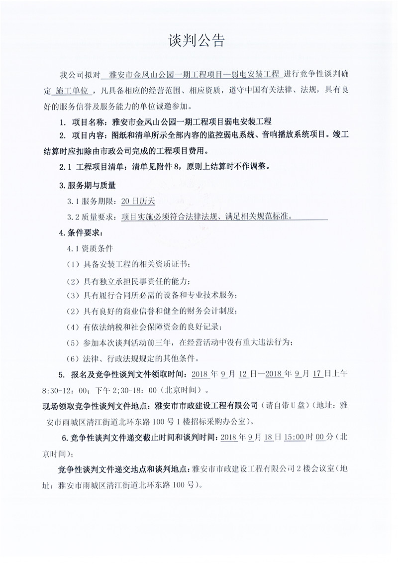 雅安市金鳳山公園一期工程項目——弱電安裝工程(競爭談判公告)