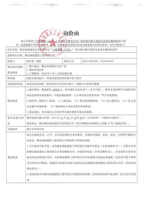 大興壹號(北苑)項目位于雅安萬達廣場的城市展廳裝修及灰塵布置物料詢價函