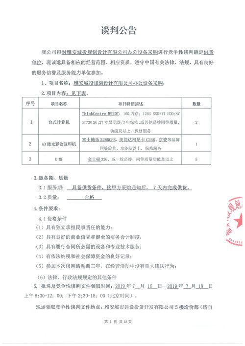 雅安城投規(guī)劃設計有限公司辦公設備采購競爭性談判公告