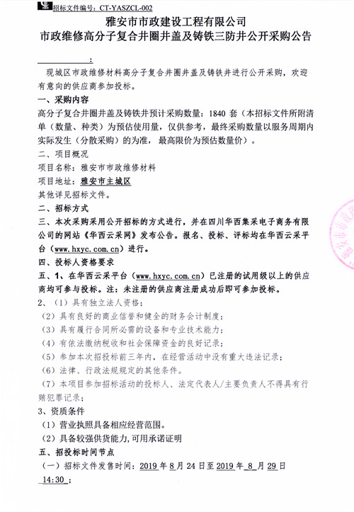 市政維修高分子復(fù)合井圈井蓋及鑄鐵三防井公開(kāi)采購(gòu)公告