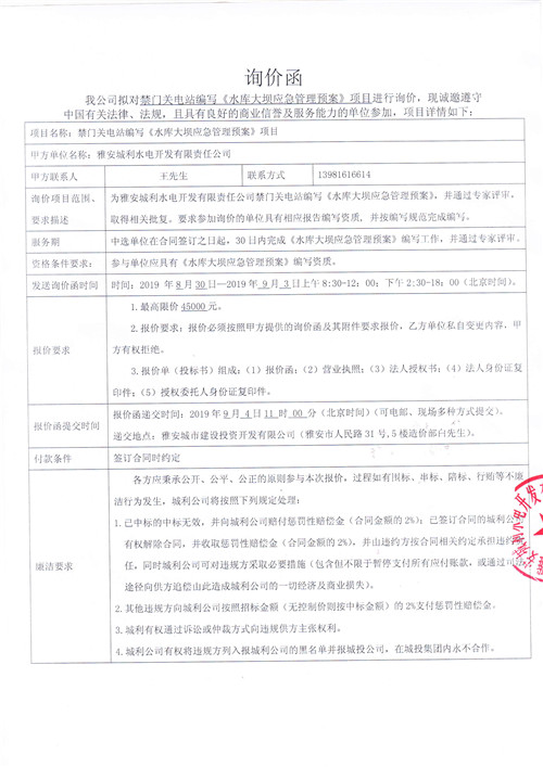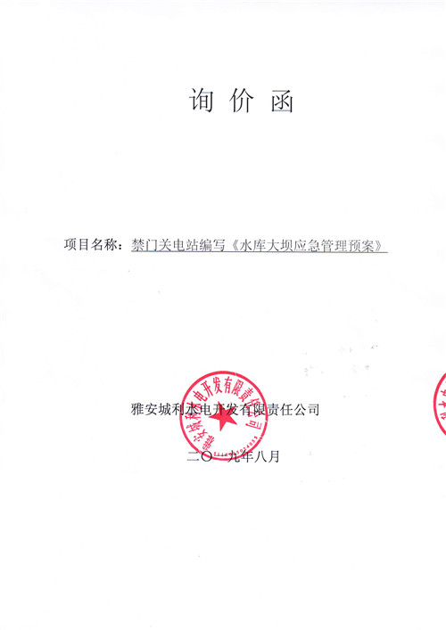 雅安城利水電開發(fā)有限責任公司禁門關電站編寫《水庫大壩應急管理預案》競爭性談判公告
