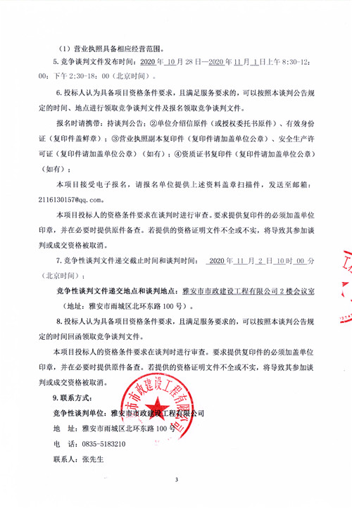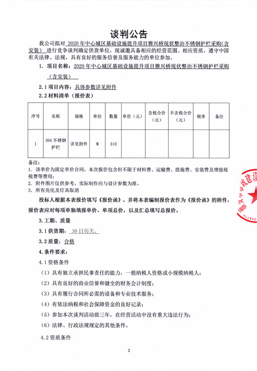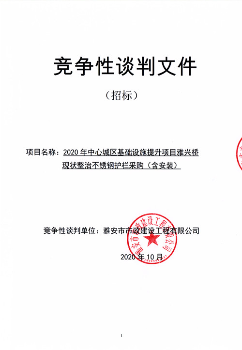 市政公司2020年中心城區(qū)基礎(chǔ)設(shè)施提升項(xiàng)目雅興橋現(xiàn)狀整治不銹鋼護(hù)欄采購(gòu)(含安裝)競(jìng)爭(zhēng)性談判公告