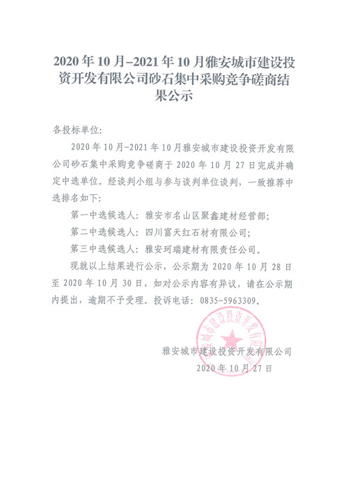 2020年10月-2021年10月雅安城市建設(shè)投資開發(fā)有限公司砂石集中采購(gòu)競(jìng)爭(zhēng)磋商結(jié)果公示