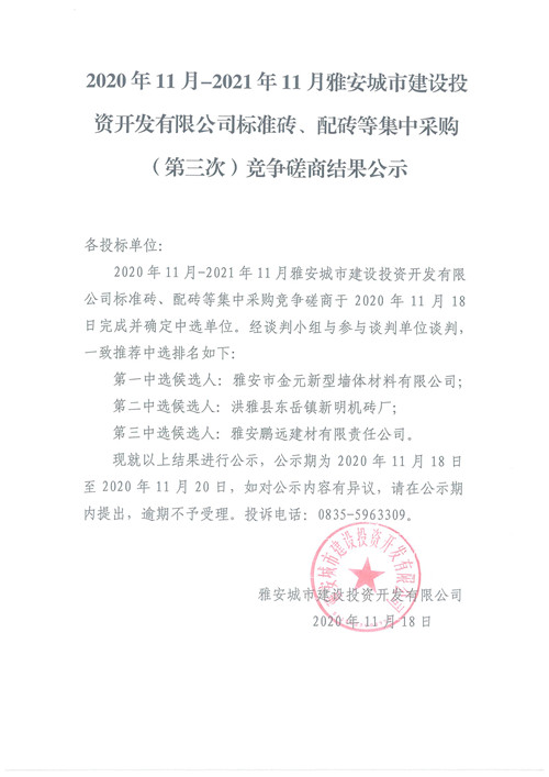 2020年11月-2021年11月雅安城市建設(shè)投資開(kāi)發(fā)有限公司標(biāo)準(zhǔn)磚、配磚等集中采購(gòu)(第三次)競(jìng)爭(zhēng)磋商結(jié)果公示