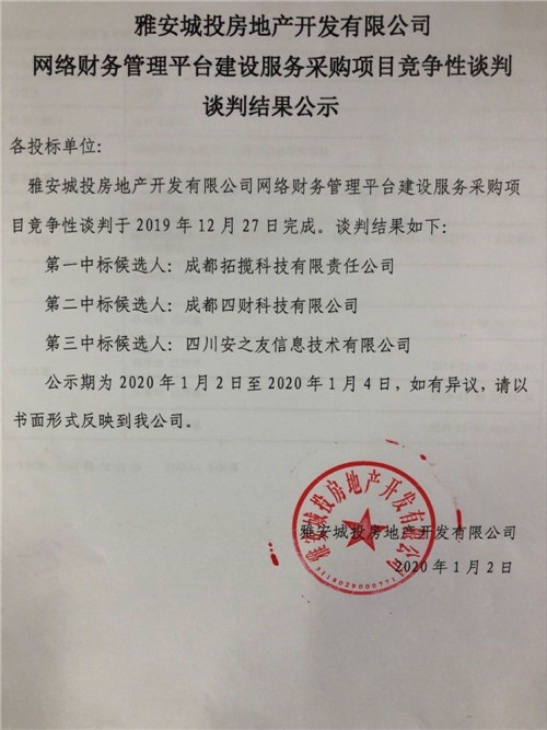 雅安城投房地產開發(fā)有限公司網絡財務管理平臺建設服務采購項目競爭性談判結果公司