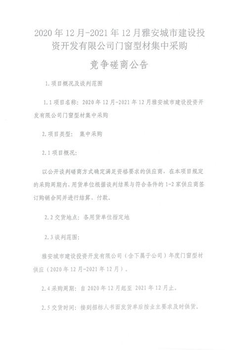 2020年12月-2021年12月雅安城市建設投資開發(fā)有限公司門窗型材集中采購競爭磋商公告