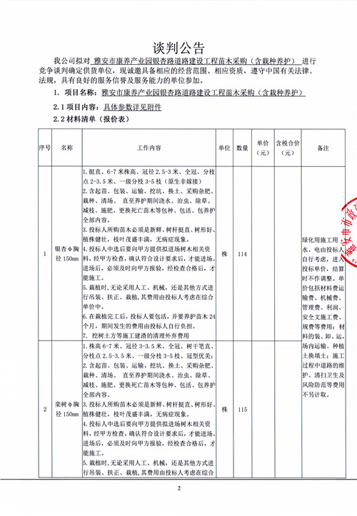 雅安市康養(yǎng)產(chǎn)業(yè)園銀杏路道路建設工程苗木采購(含栽種養(yǎng)護)談判公告