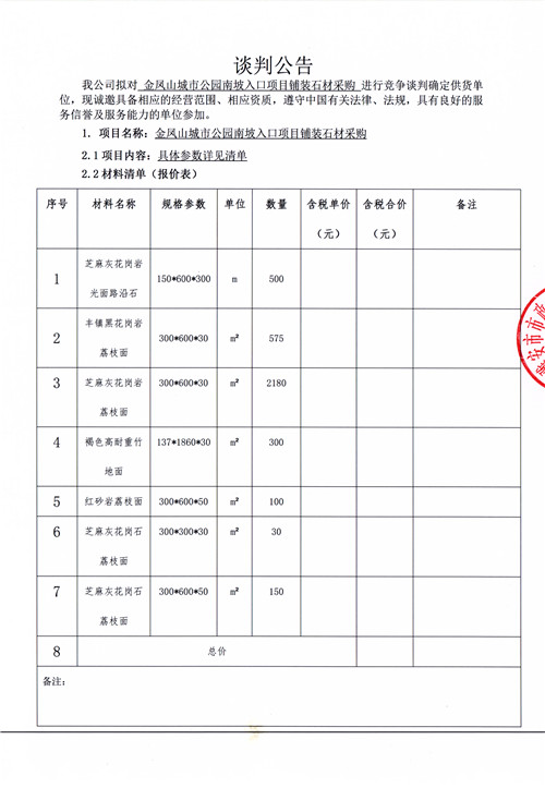 金鳳山城市公園南坡入口項(xiàng)目鋪裝石材采購競(jìng)爭(zhēng)性談判公告