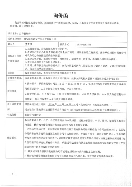 城投公司打印機(jī)詢價(jià)函