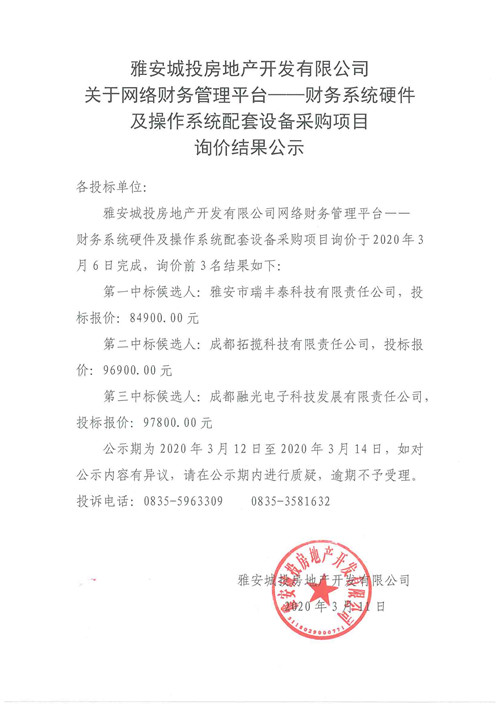 城投房地產(chǎn)公司關(guān)于網(wǎng)絡(luò)財務(wù)管理平臺——財務(wù)系統(tǒng)硬件及操作系統(tǒng)配套設(shè)備采購項(xiàng)目詢價結(jié)果公示