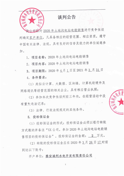 城利水電公司2020年土地溝電站電能銷售競(jìng)爭(zhēng)性談判公告