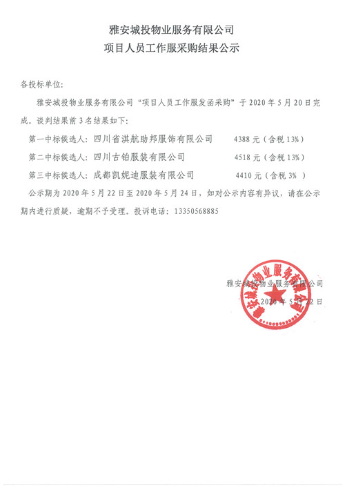 城投物業(yè)公司項(xiàng)目人員工作服采購結(jié)果公示