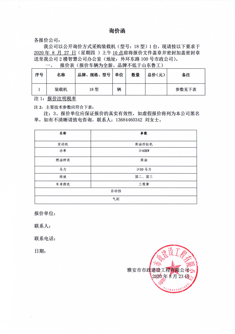 雅安市市政建設(shè)工程有限公司采購裝載機(jī)(型號(hào):18型)詢價(jià)函