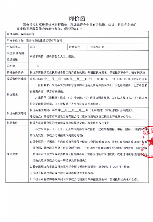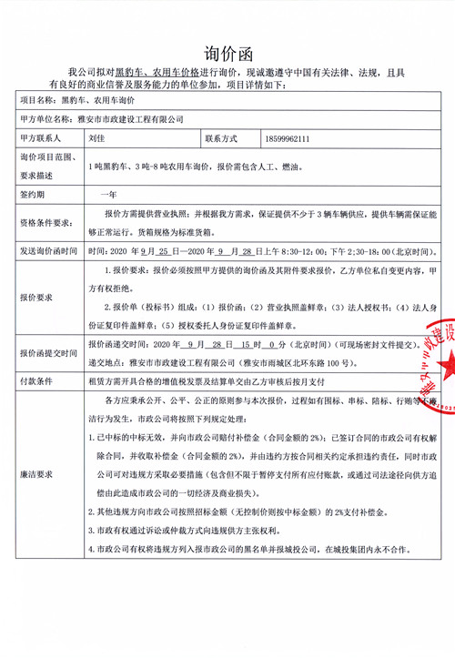 詢價(jià)函(黑豹車(chē)、農(nóng)用車(chē)、雙橋車(chē)租賃)