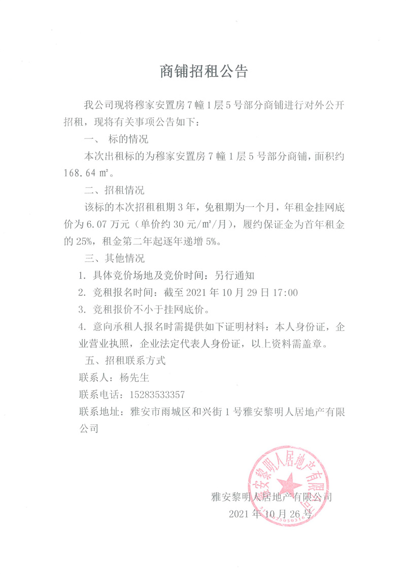 穆家安置房7幢1層5號(hào)部分商鋪招租公告