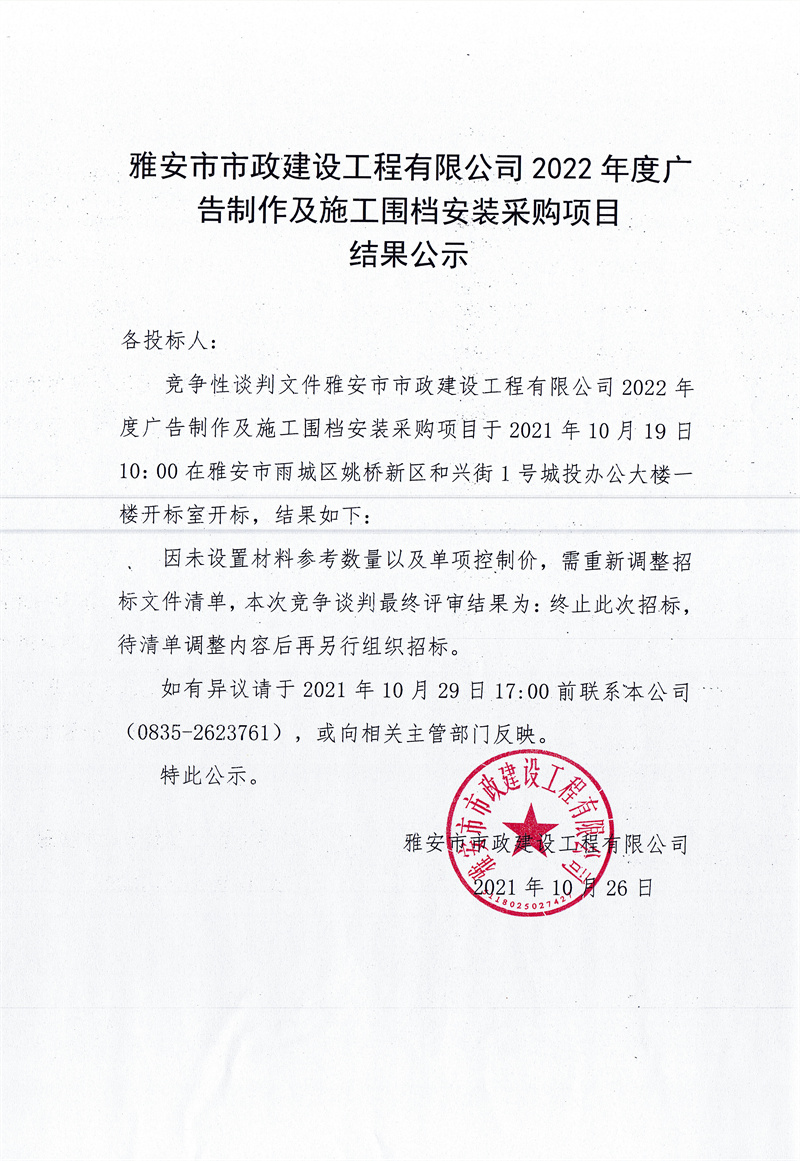 雅安市市政建設工程有限公司2022年度廣告制作及施工圍檔安裝采購項目競爭性談判結果公示