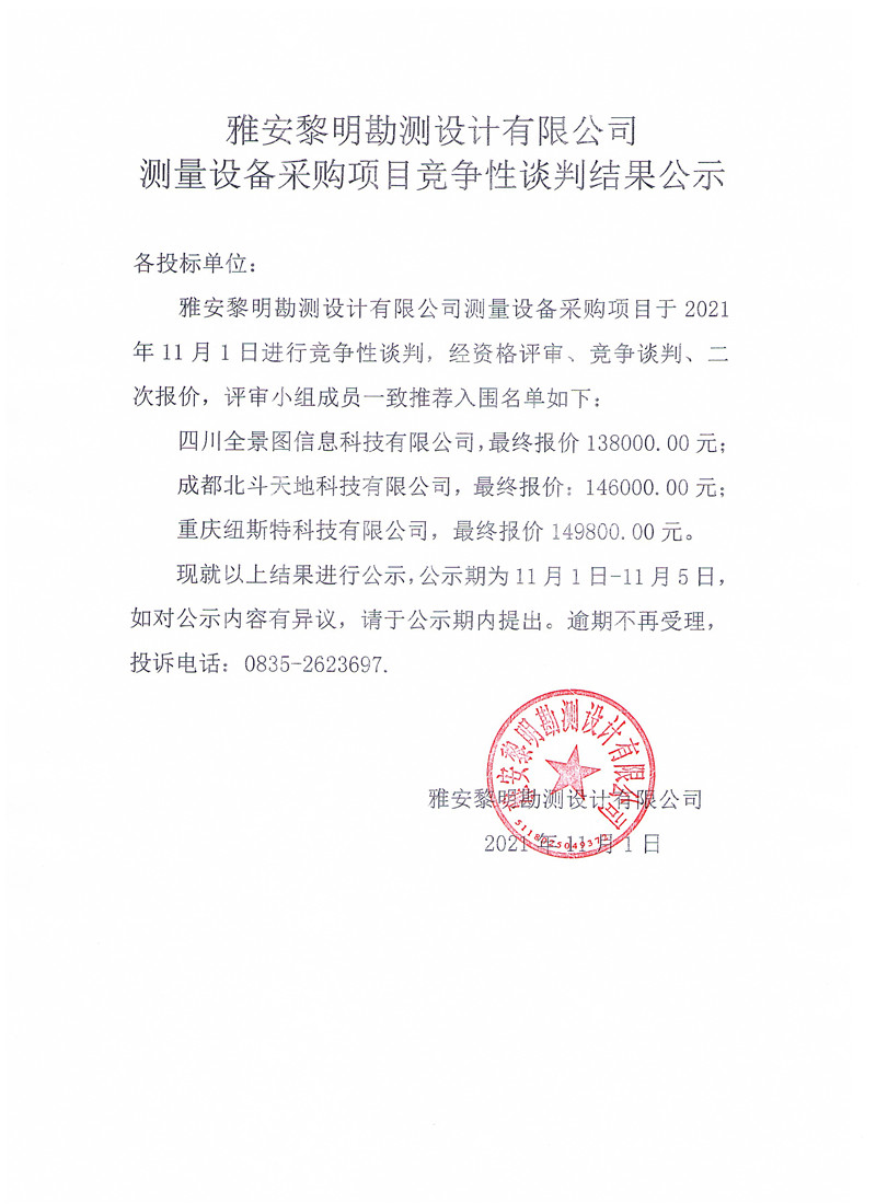 雅安黎明勘測設(shè)計(jì)有限公司測量設(shè)備采購競爭性談判結(jié)果公示