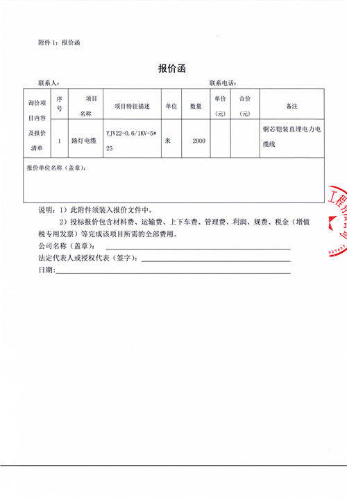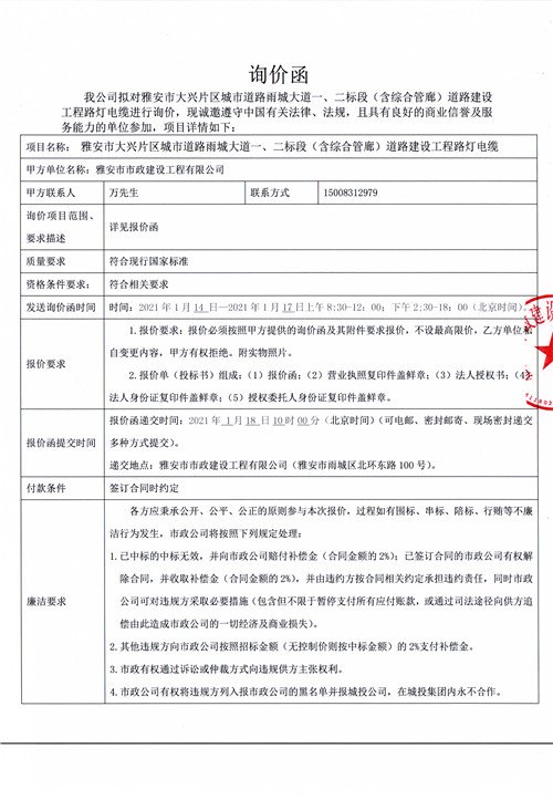 雅安市大興片區(qū)城市道路雨城大道一、二標段(含綜合管廊)道路建設工程路燈電纜詢價函