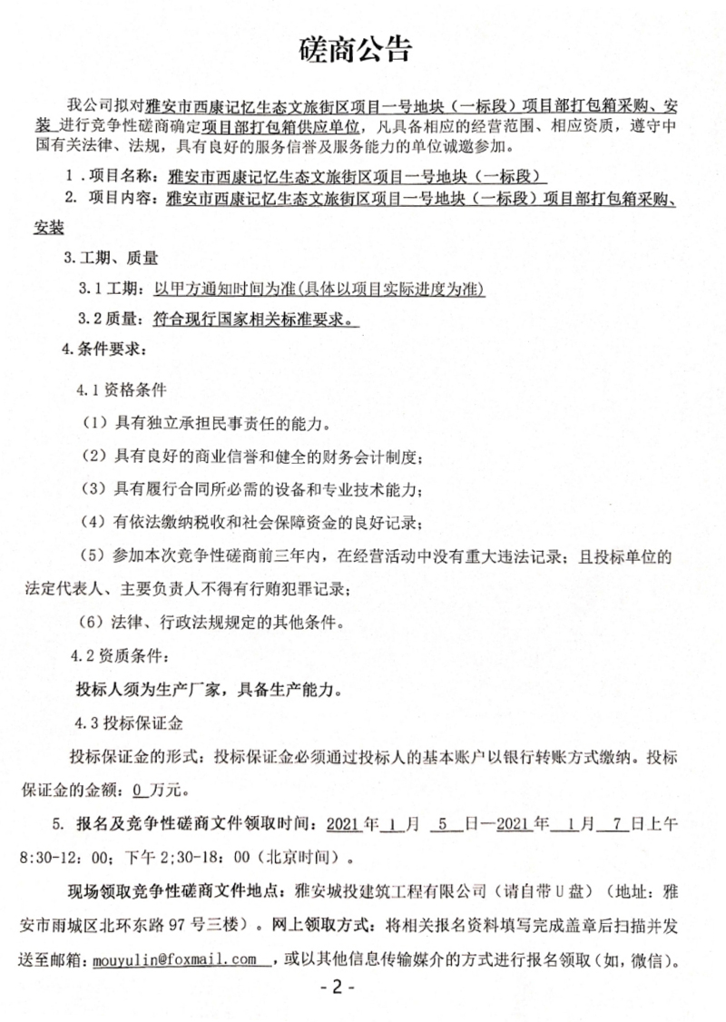 雅安市西康記憶生態(tài)文旅街區(qū)項(xiàng)目一號(hào)地塊(一標(biāo)段)項(xiàng)目部打包箱采購(gòu)、安裝競(jìng)爭(zhēng)性磋商公告