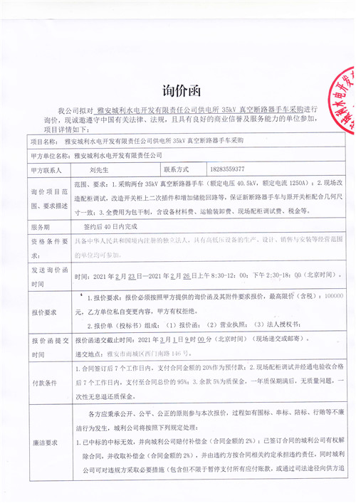 城利水電公司供電所35kV真空斷路器手車采購詢價(jià)函