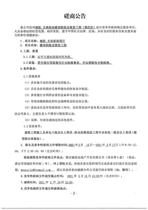 城投地產公司文曲新座樓頂拆除及恢復工程(第四次)競爭性磋商公告