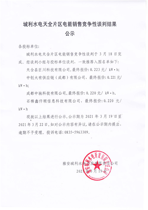 城投水電公司天全片區(qū)電站電能銷(xiāo)售競(jìng)爭(zhēng)性談判結(jié)果公示
