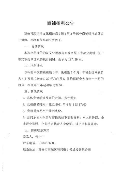 漢文化棚改房2幢2層2號部分商鋪招租公告
