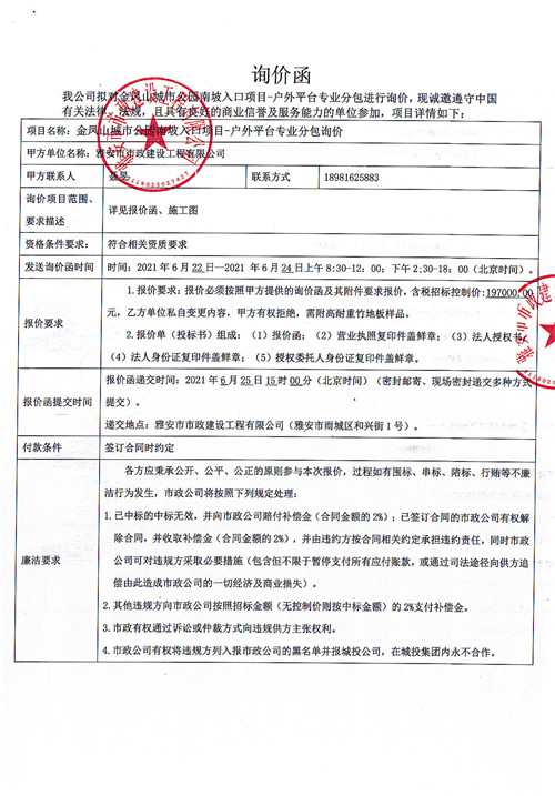 雅安市政公司金鳳山城市公園南坡入口項(xiàng)目-戶外平臺(tái)專業(yè)分包詢價(jià)函