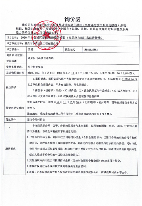 雅安市政公司2020年中心城區(qū)基礎設施提升項目(興居路與濱江東路連接線)照明、標識、標牌詢價函
