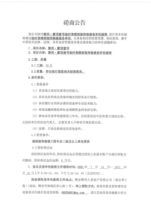 黎明人居公司黎明·蒙頂壹號(hào)臨時(shí)售樓部裝飾裝修競(jìng)爭(zhēng)性磋商公告
