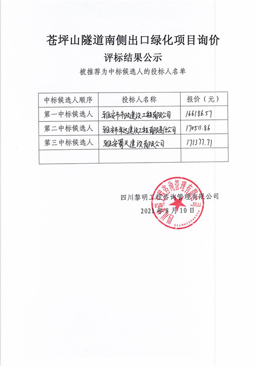 黎明咨詢公司蒼坪山隧道南側(cè)出口綠化項(xiàng)目詢價(jià)評(píng)標(biāo)結(jié)果公示