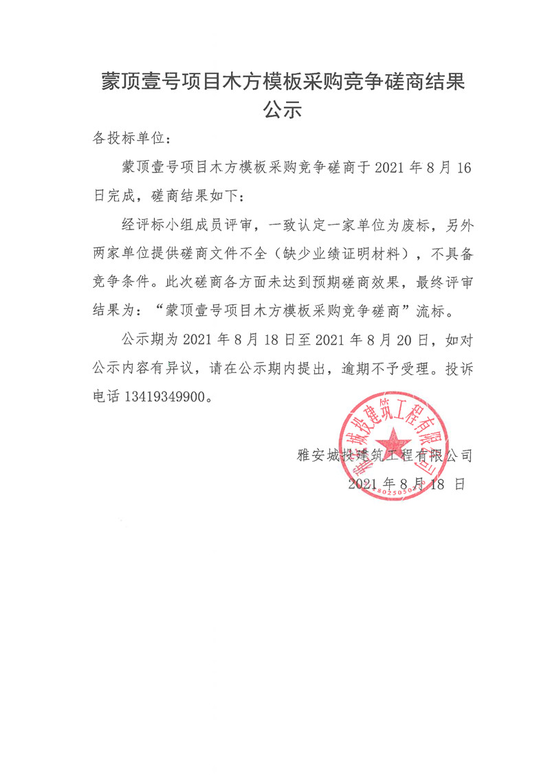 城投建工公司蒙頂壹號(hào)項(xiàng)目木方模板采購競(jìng)爭(zhēng)磋商結(jié)果公示
