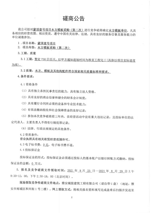 城投建工公司蒙頂壹號(hào)項(xiàng)目木方模板采購(gòu)競(jìng)爭(zhēng)磋商公告(第二次)