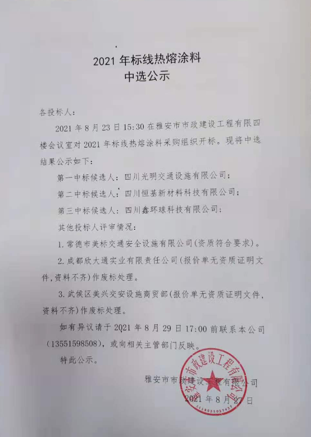市政公司2021年標線熱熔涂料詢價結(jié)果公示
