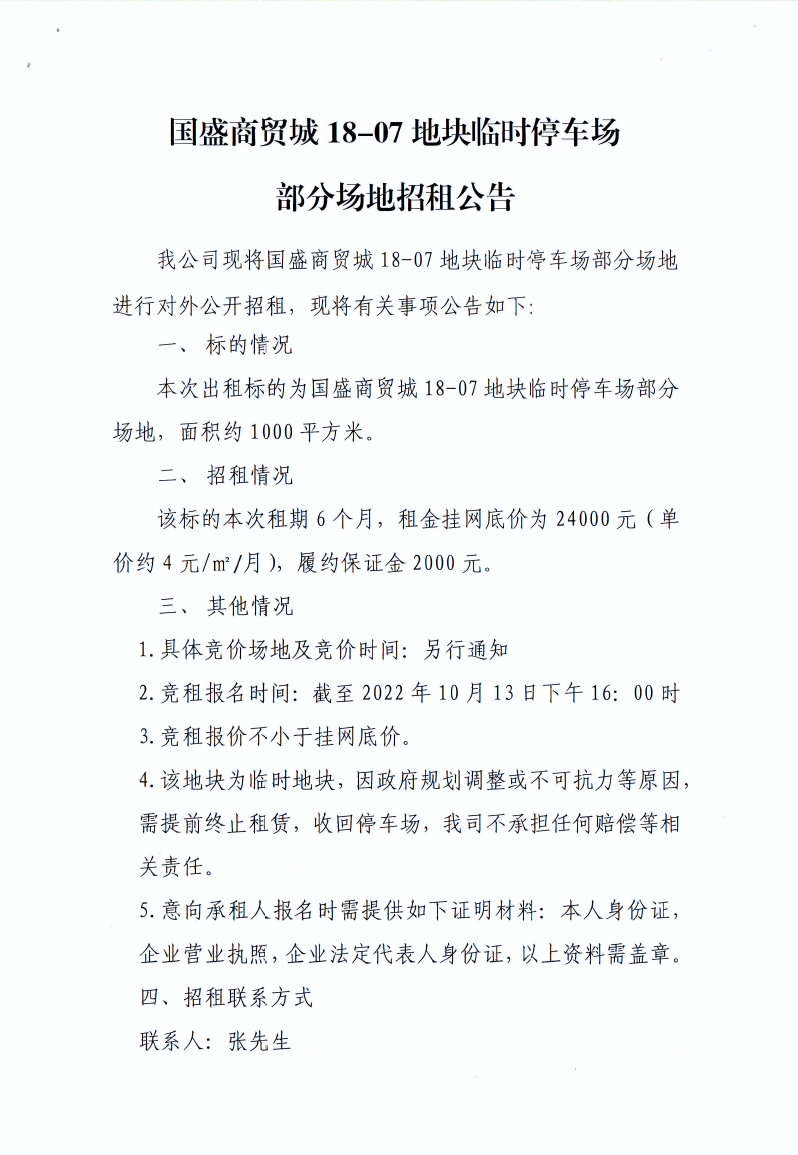 國盛商貿(mào)城18-07地塊臨時(shí)停車場部分場地招租公告