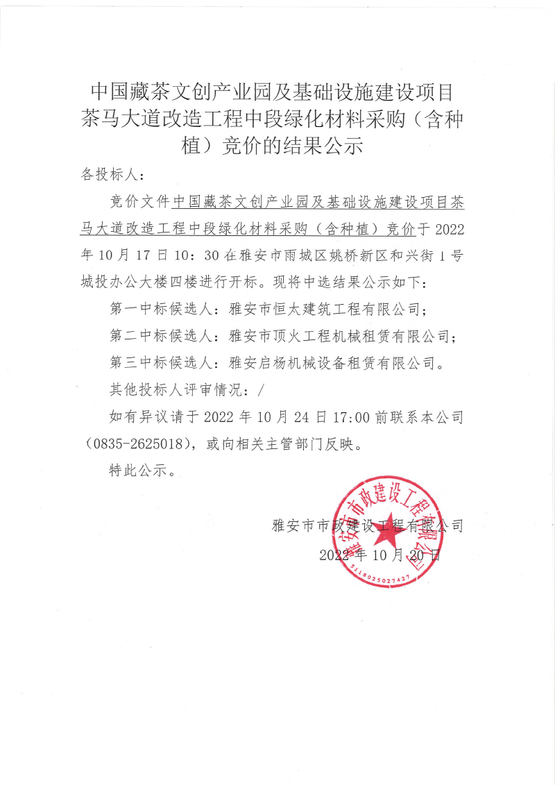 中國藏茶文創(chuàng)產(chǎn)業(yè)園及基礎(chǔ)設(shè)施建設(shè)項(xiàng)目--茶馬大道改造工程中段綠化材料采購(含種植)競價(jià)的結(jié)果公示
