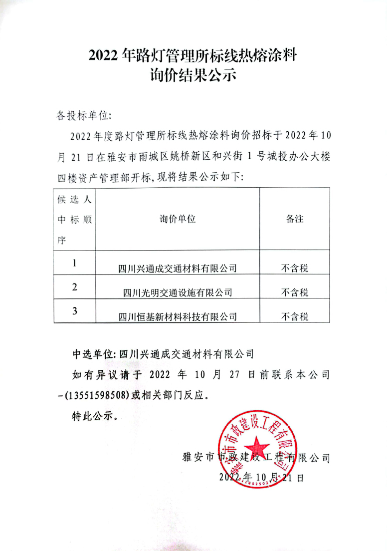 2022年路燈管理所標(biāo)線(xiàn)熱熔涂料詢(xún)價(jià)結(jié)果公示
