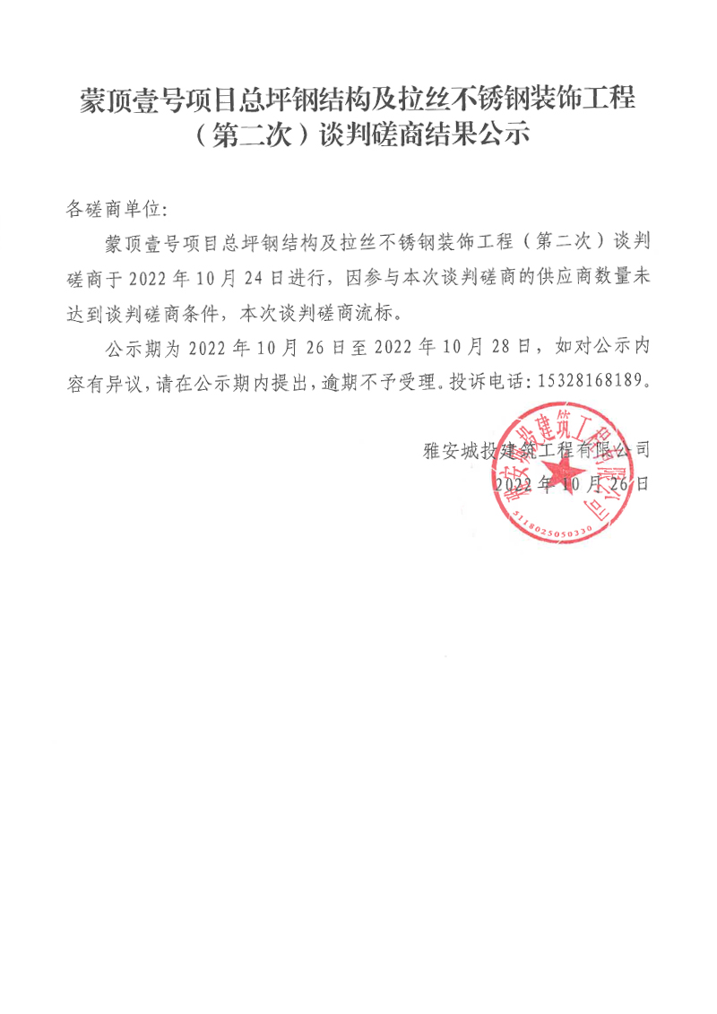 蒙頂壹號項目總坪鋼結構及拉絲不銹鋼裝飾工程(第二次)談判磋商結果公示