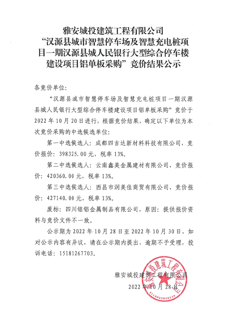 漢源縣城市智慧停車場(chǎng)及智慧充電樁項(xiàng)目一期漢源縣城人民銀行大型綜合樓停車樓建設(shè)項(xiàng)目鋁單板材料采購競(jìng)價(jià)結(jié)果公示