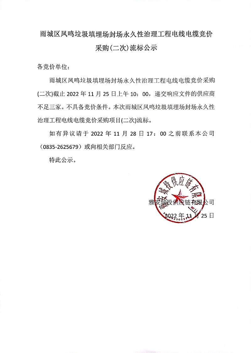 雨城區(qū)鳳鳴垃圾填埋場封場永久性治理工程電線電纜競價采購(二次)流標(biāo)公示