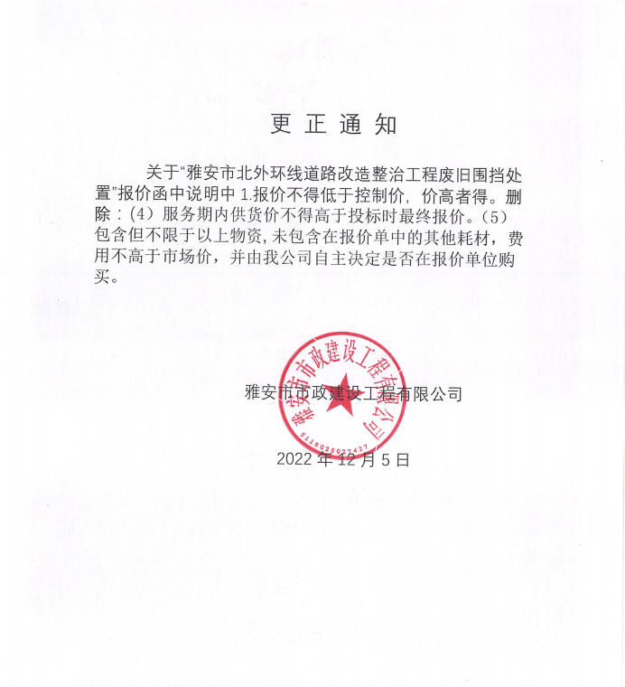 雅安市北外環(huán)道路改造整治工程廢舊圍擋處置詢價公告(更正通知)