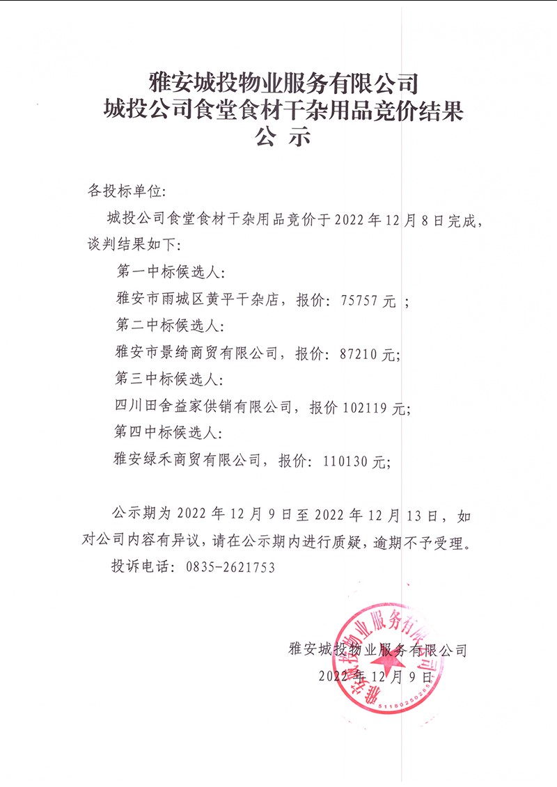 雅安城投物業(yè)服務有限公司城投公司食堂干雜競價結果公示