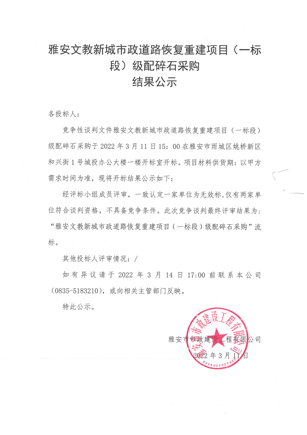 雅安文教新城市政道路恢復(fù)重建項目(一標(biāo)段)級配碎石采購結(jié)果公示