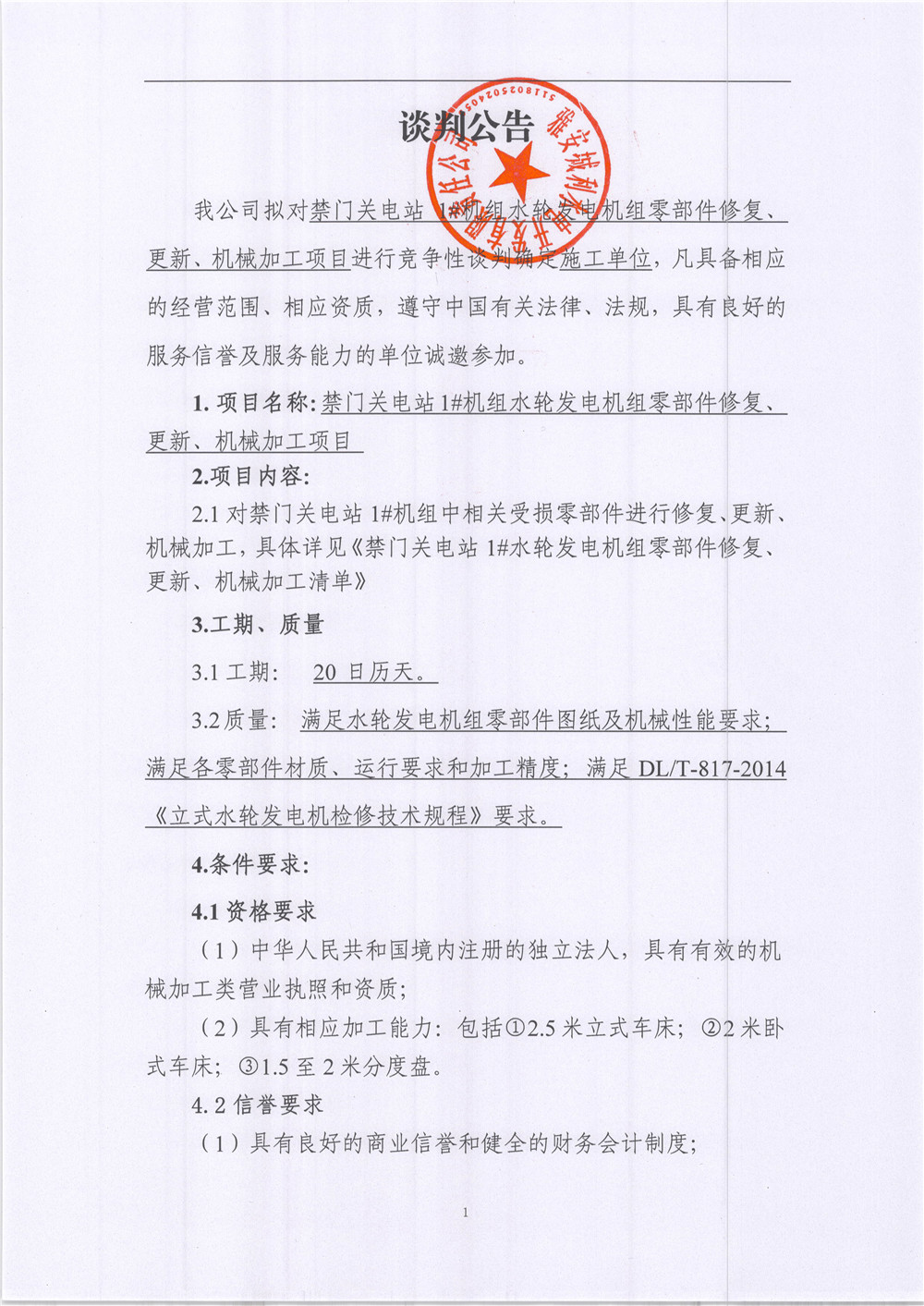 禁門關(guān)電站1#機(jī)組水輪發(fā)電機(jī)組零部件更新、機(jī)械加工項(xiàng)目競爭性談判公告