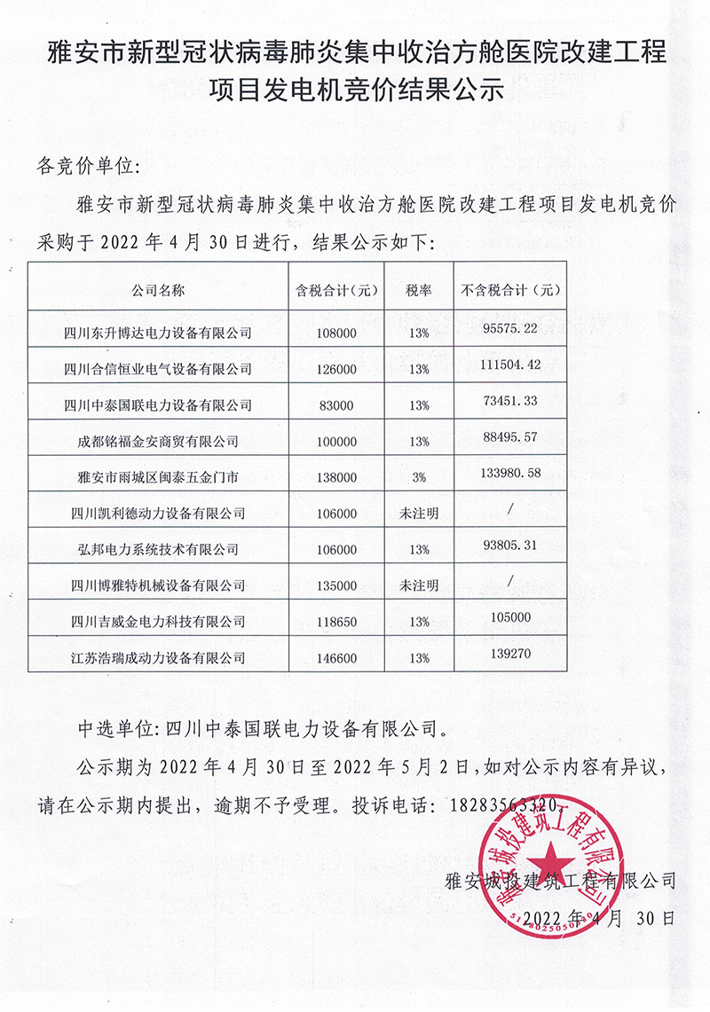 雅安市新型冠狀病毒肺炎集中收治方艙醫(yī)院改建工程項目發(fā)電機競價結果公示