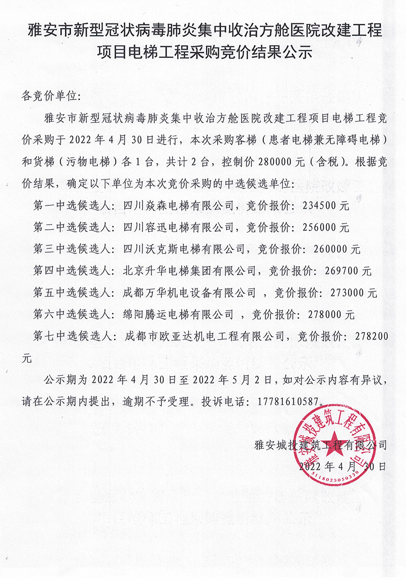 雅安市新型冠狀病毒肺炎集中收治方艙醫(yī)院改建工程項(xiàng)目電梯工程采購競價(jià)結(jié)果公示