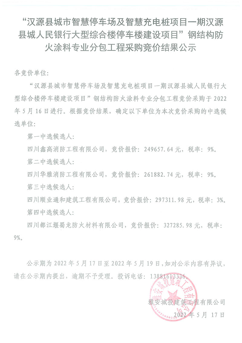 漢源縣城市智慧停車場及智慧充電樁項(xiàng)目一期漢源縣城人民銀行大型綜合樓停車樓建設(shè)項(xiàng)目防火涂料專業(yè)分包工程采購競價(jià)結(jié)果公示